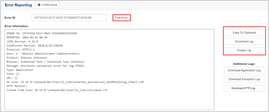 When an issue is encountered in the LCMS an error code message displays for the user. Administrators and/or users with permissions may investigate the issue and provide more details as to why it occurred by using the Error Reporting feature.
